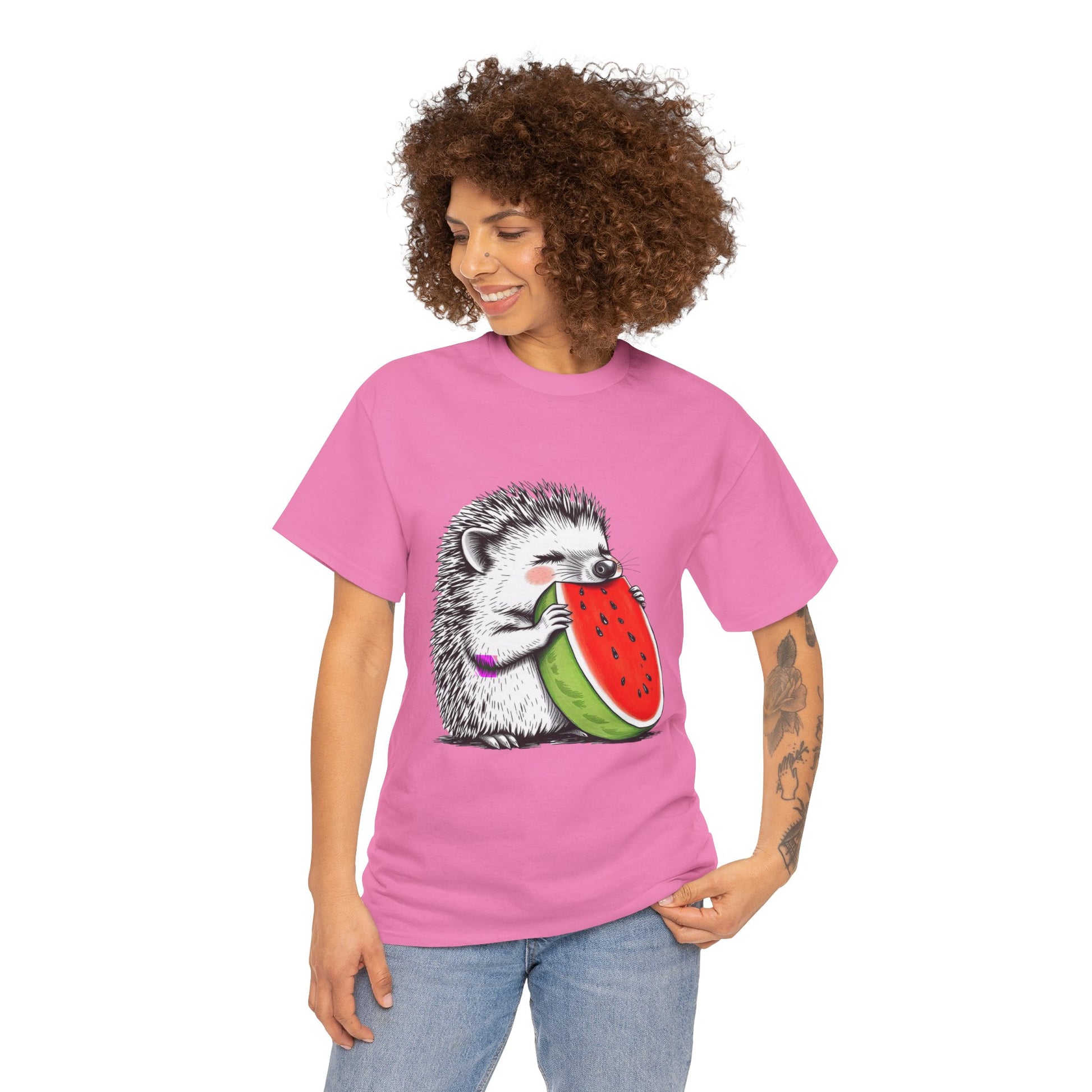 Introducing a charming and fun Unisex Heavy Cotton Tee featuring an adorable hedgehog delightfully munching on a slice of watermelon. This shirt brings a lighthearted vibe that's perfect for casual outings, gatherings with friends, or lounging at home. Its playful design is an ideal choice for animal lovers and those with a whimsical sense of style. Great for summer picnics, birthdays, or just to brighten someone’s day. Whether you're gifting it or keeping it for yourself, this shirt will surely bring smiles wherever it goes! Perfect for all occasions and suitable for adults who appreciate comfort and sustainability.