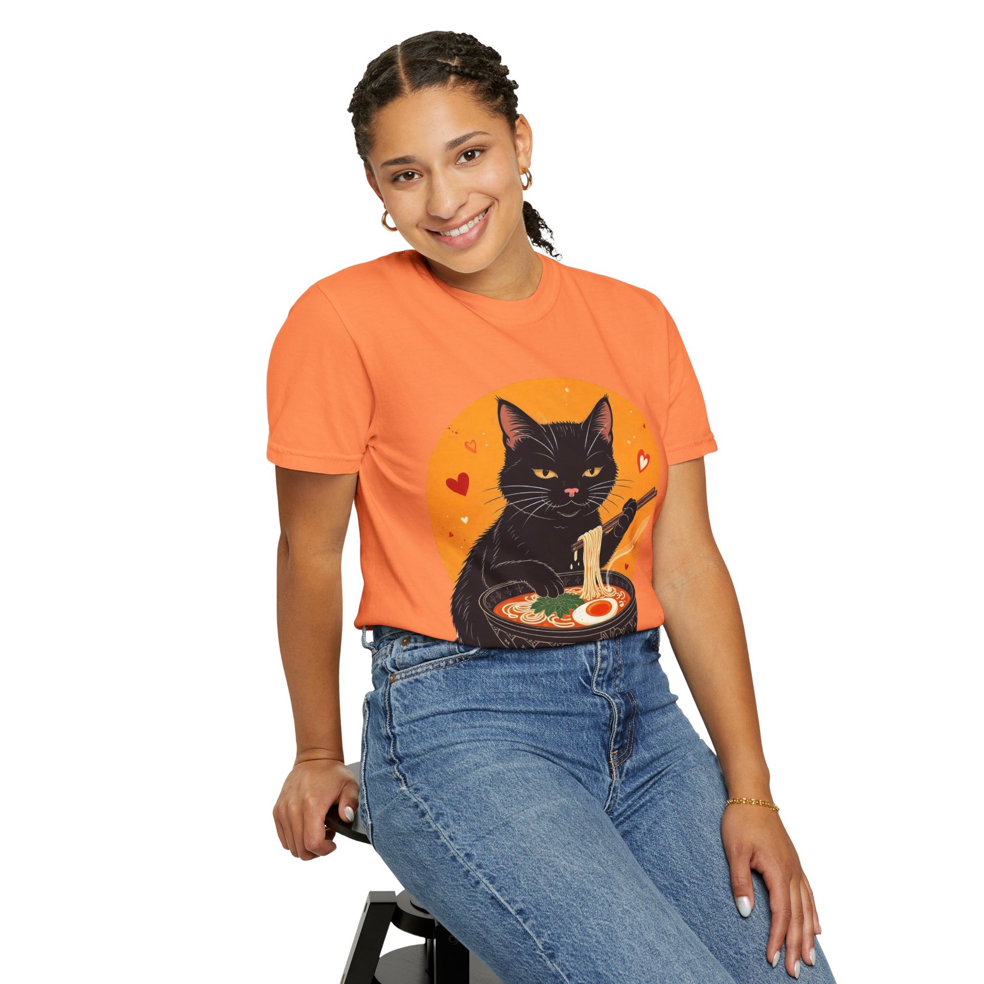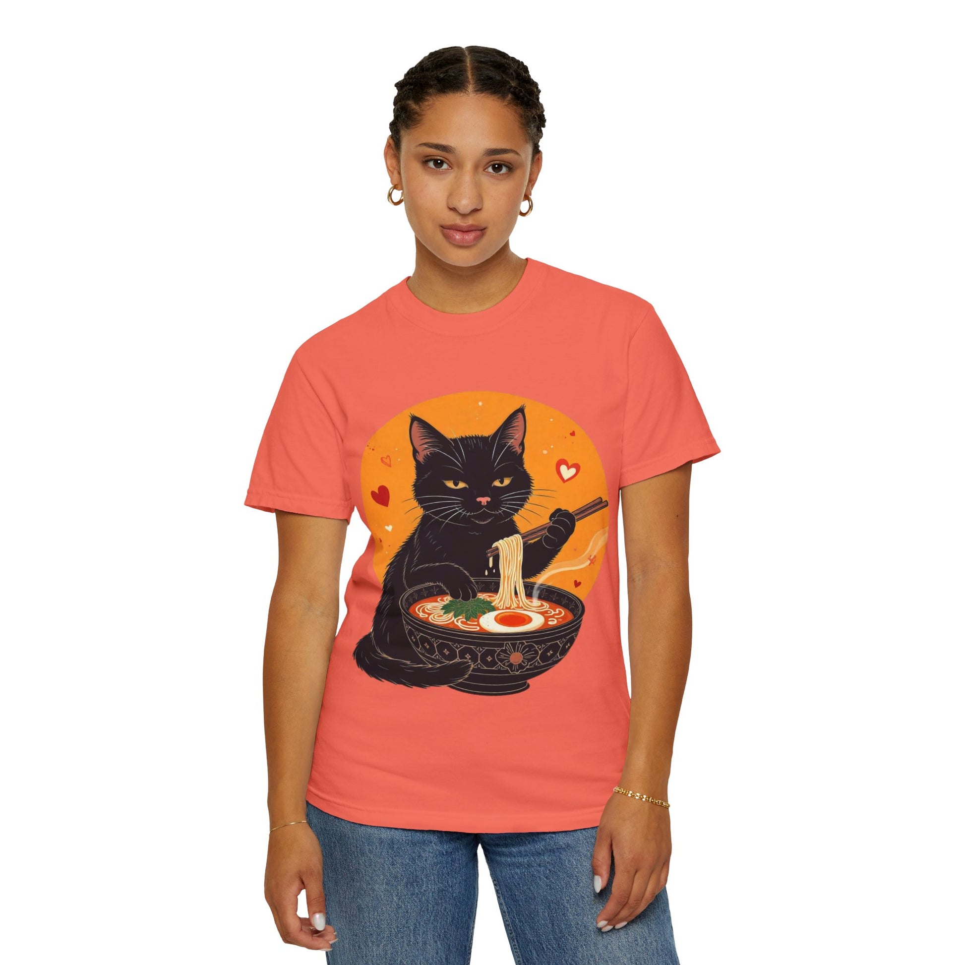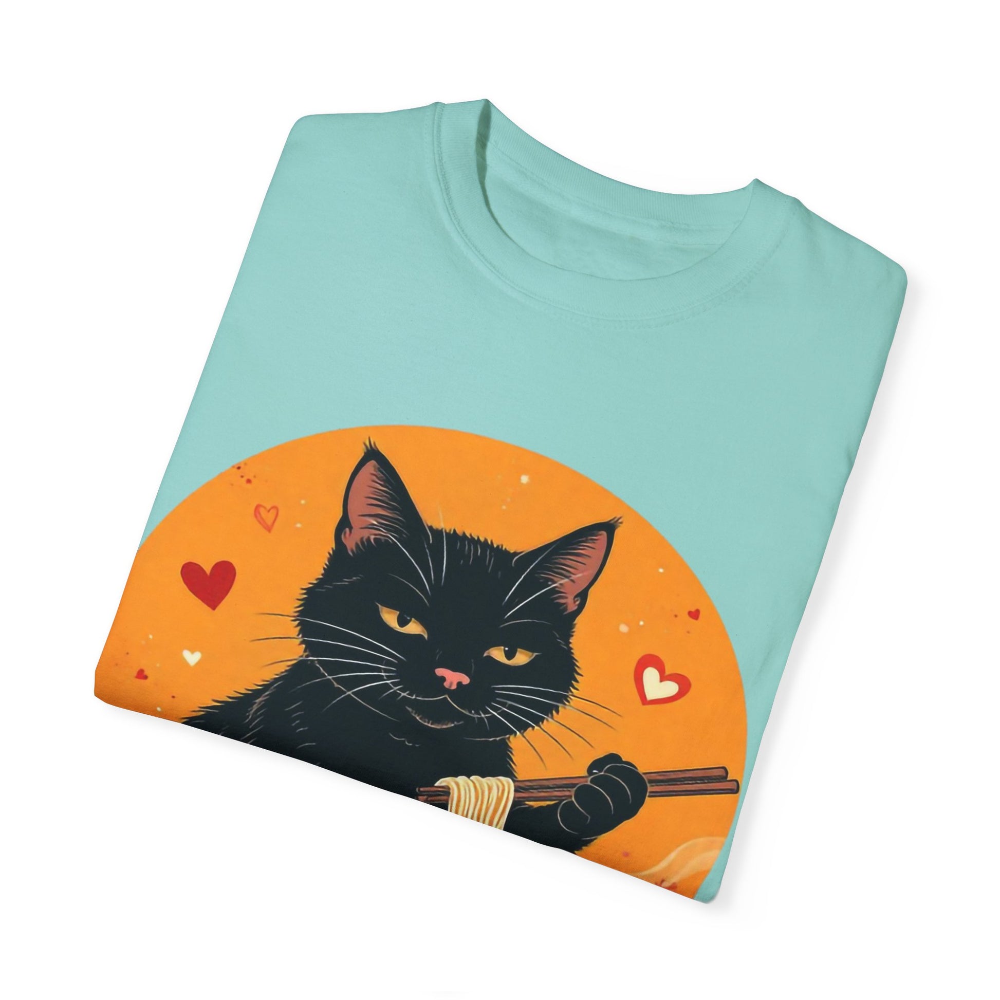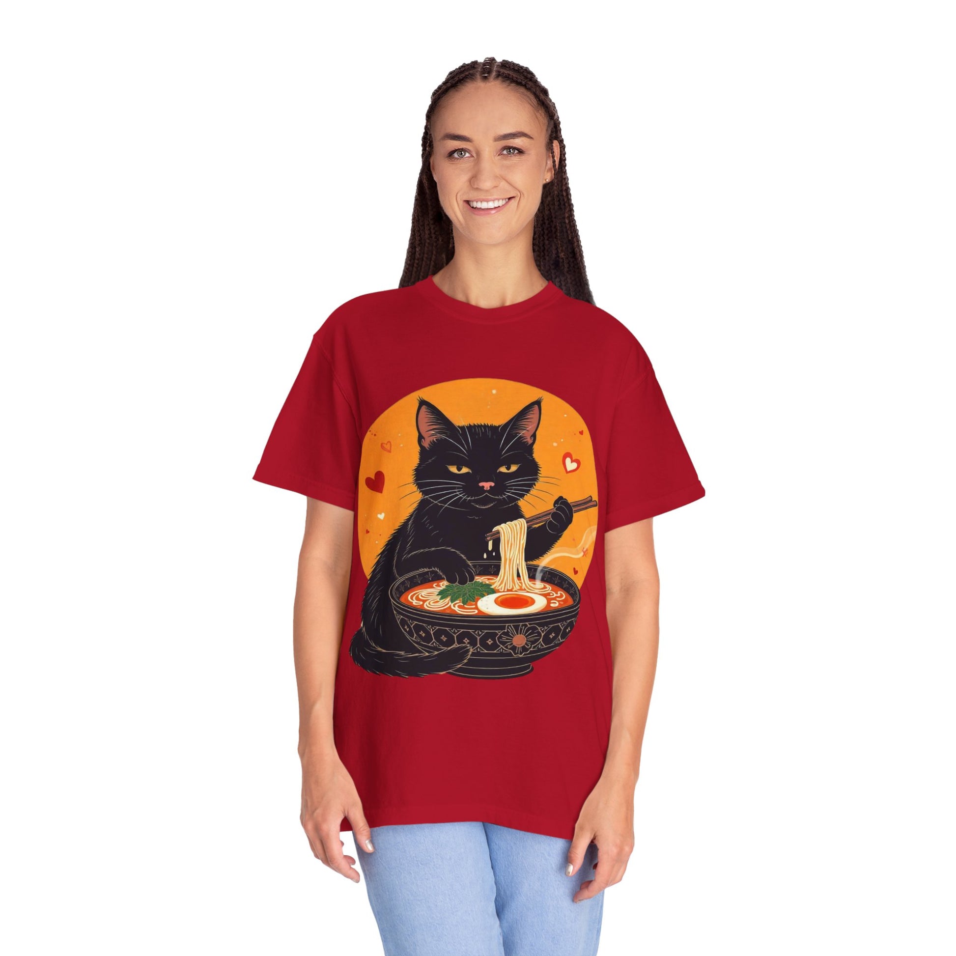 Indulge in cozy vibes with this unisex garment-dyed T-shirt, perfect for cat lovers and ramen enthusiasts alike. The playful design features a charming black cat enjoying a bowl of ramen, adding a touch of whimsy to your wardrobe. Ideal for casual outings, movie nights, or lounging at home, this tee is versatile enough for any occasion. It's the perfect gift for holidays like Cat Day, birthdays, or just to brighten someone's day! Made for everyone aged 18 and above, this T-shirt fits easily into a modern lifestyle, delivering comfort and style in one adorable package.