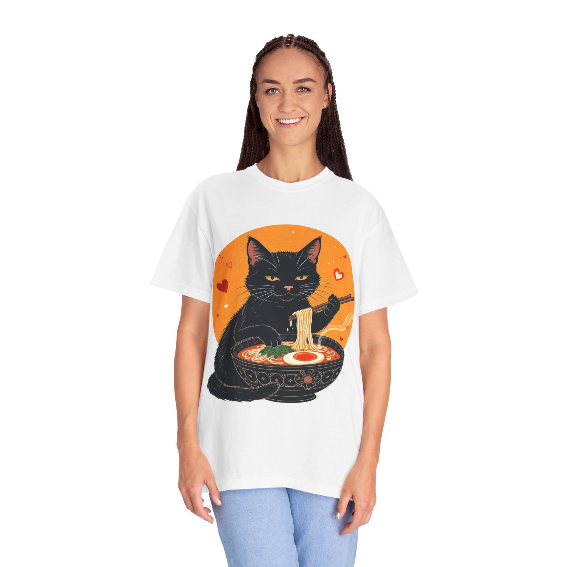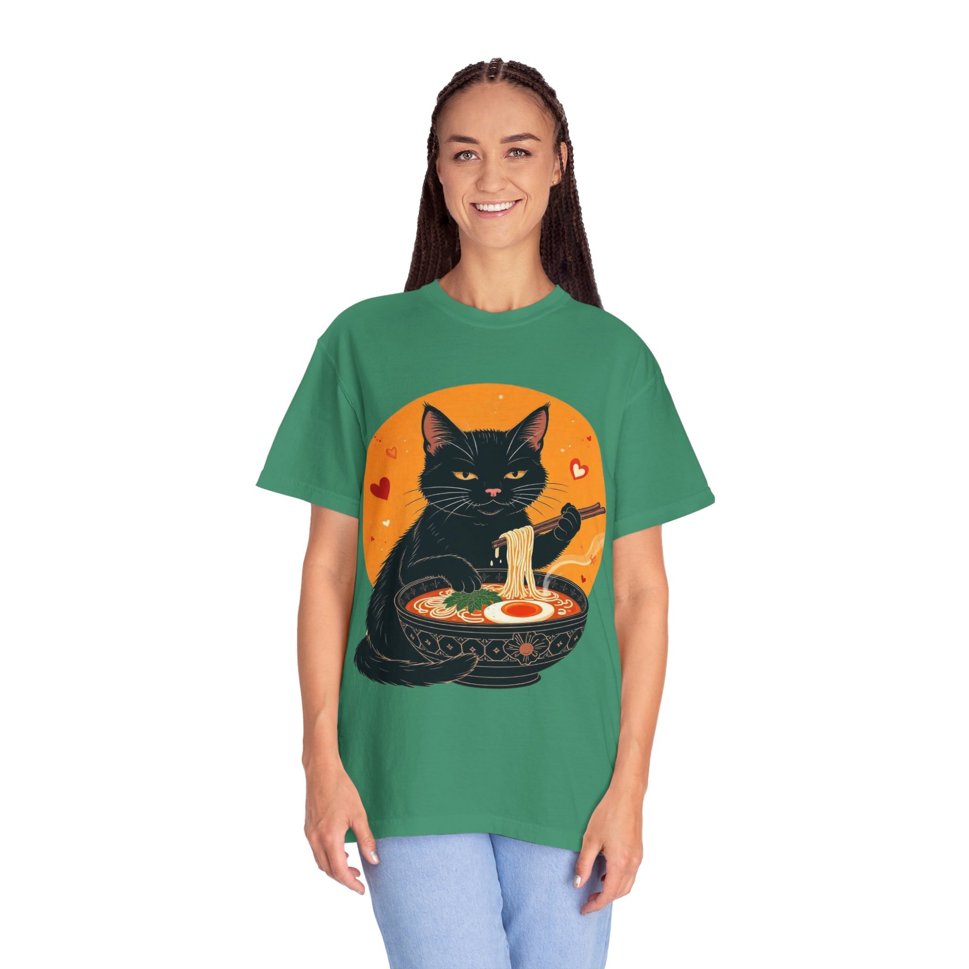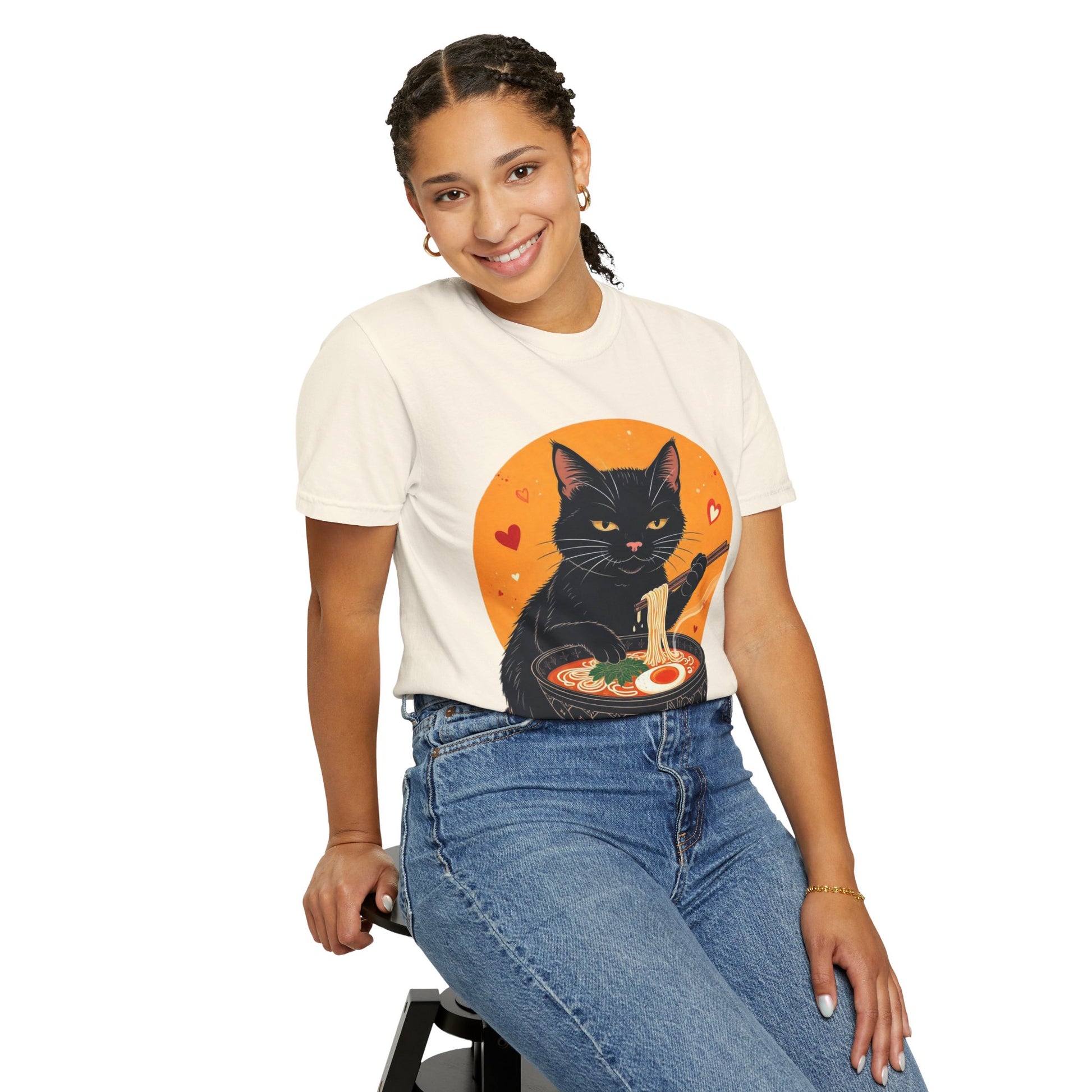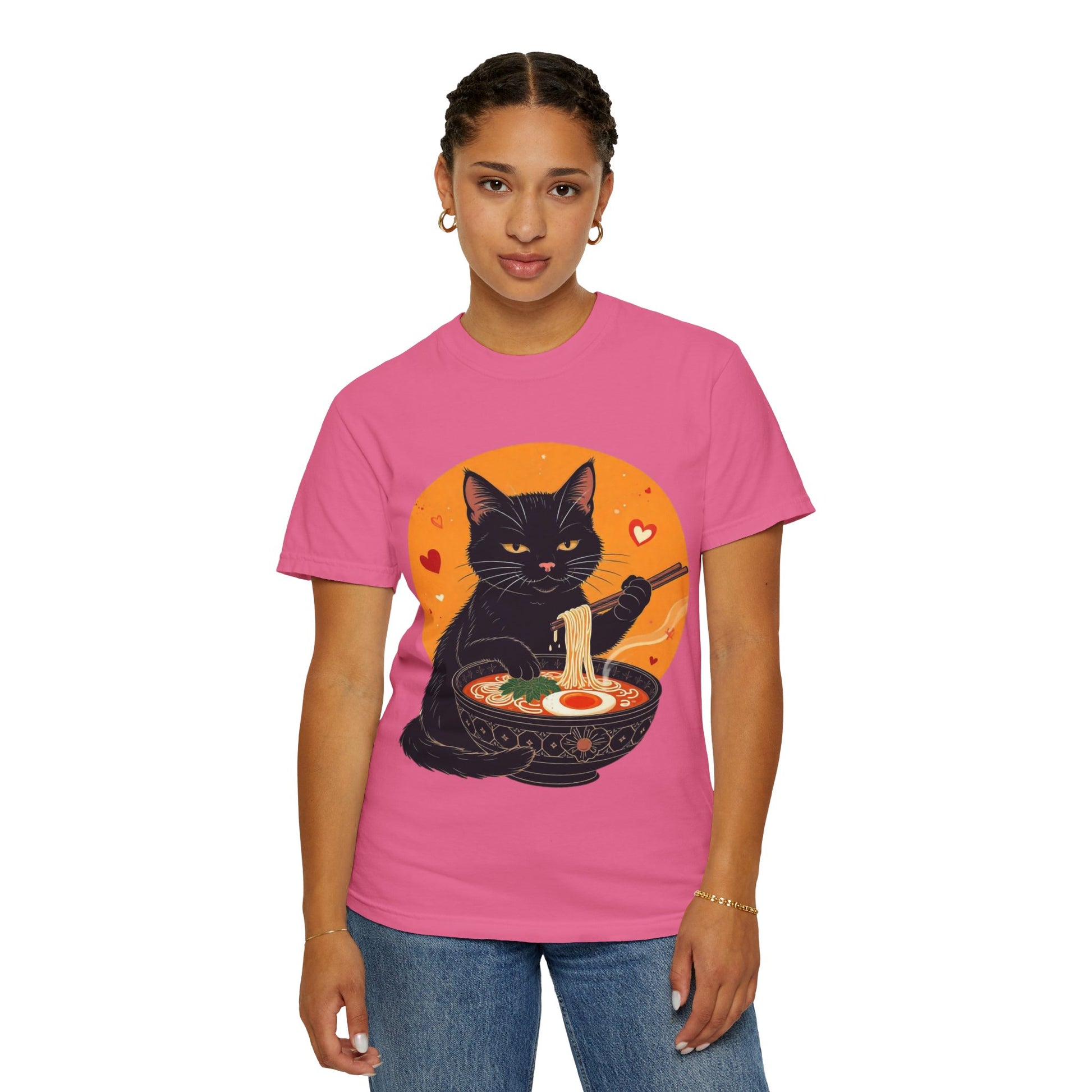 Indulge in cozy vibes with this unisex garment-dyed T-shirt, perfect for cat lovers and ramen enthusiasts alike. The playful design features a charming black cat enjoying a bowl of ramen, adding a touch of whimsy to your wardrobe. Ideal for casual outings, movie nights, or lounging at home, this tee is versatile enough for any occasion. It's the perfect gift for holidays like Cat Day, birthdays, or just to brighten someone's day! Made for everyone aged 18 and above, this T-shirt fits easily into a modern lifestyle, delivering comfort and style in one adorable package.