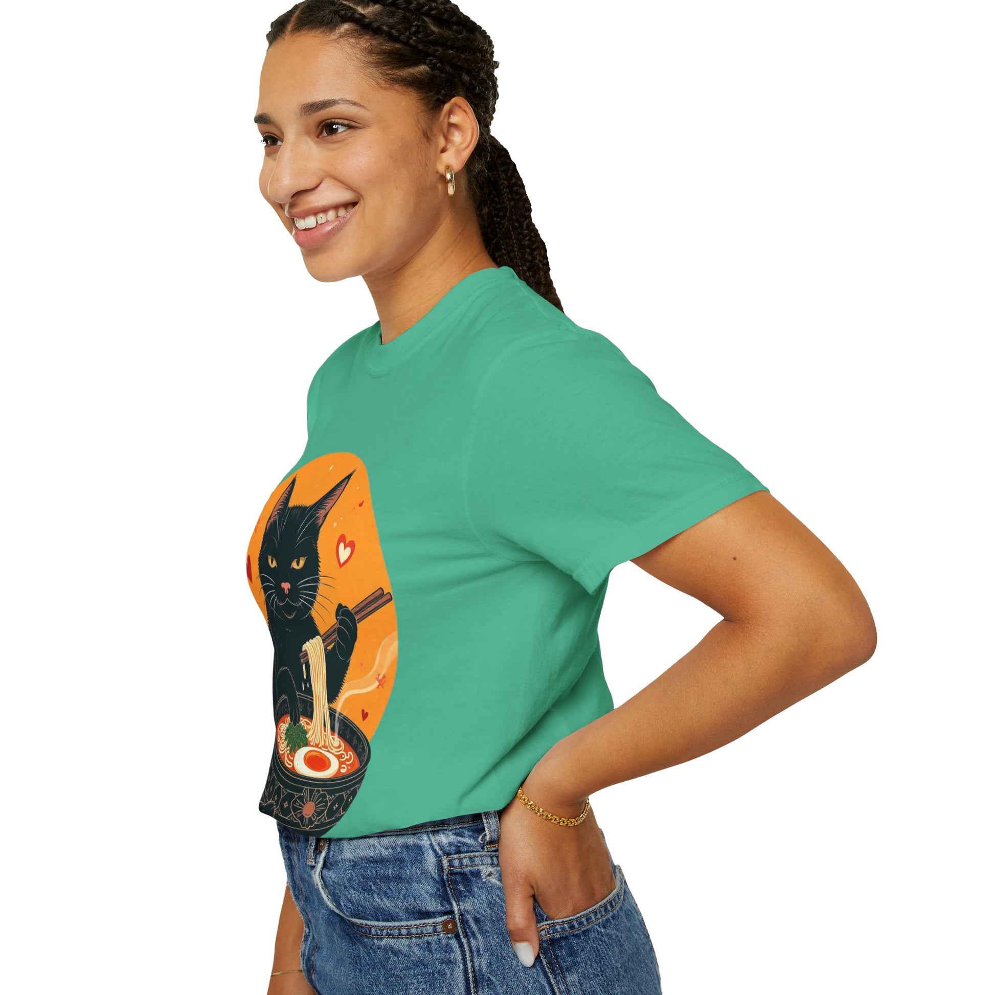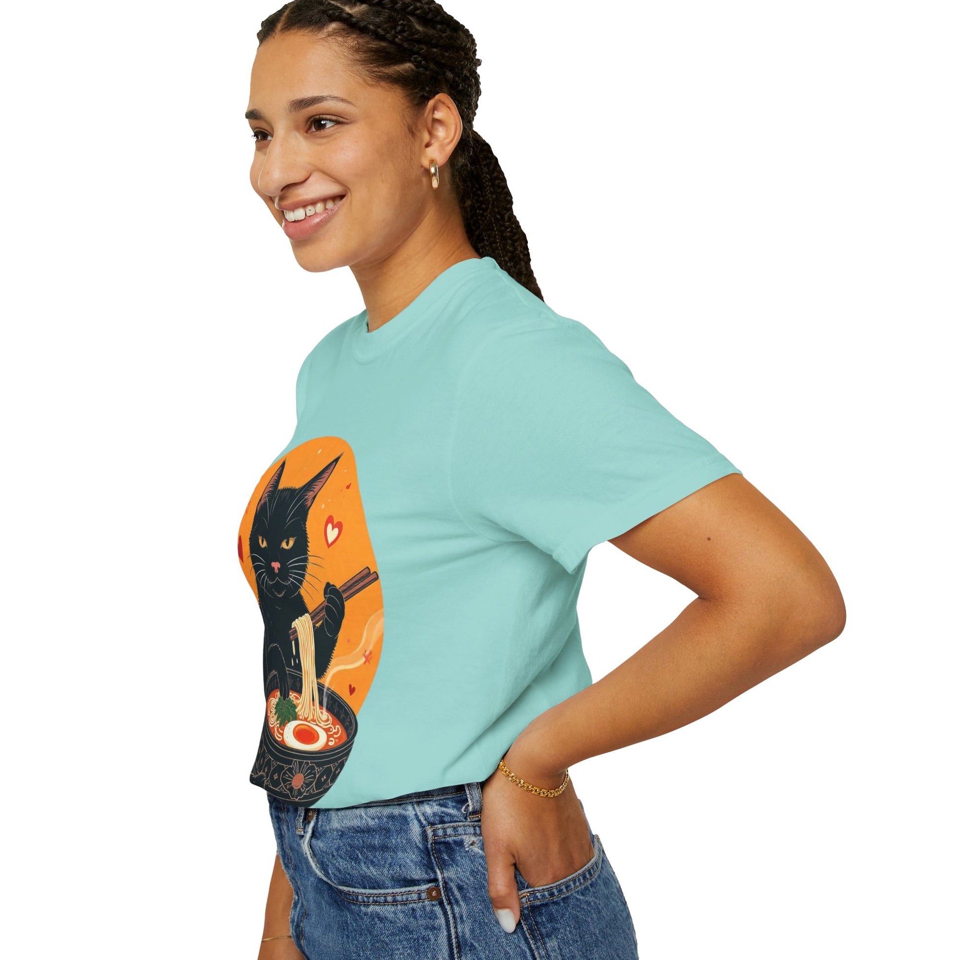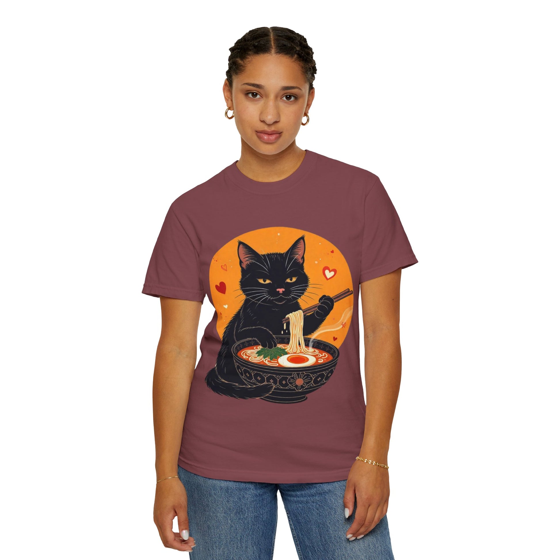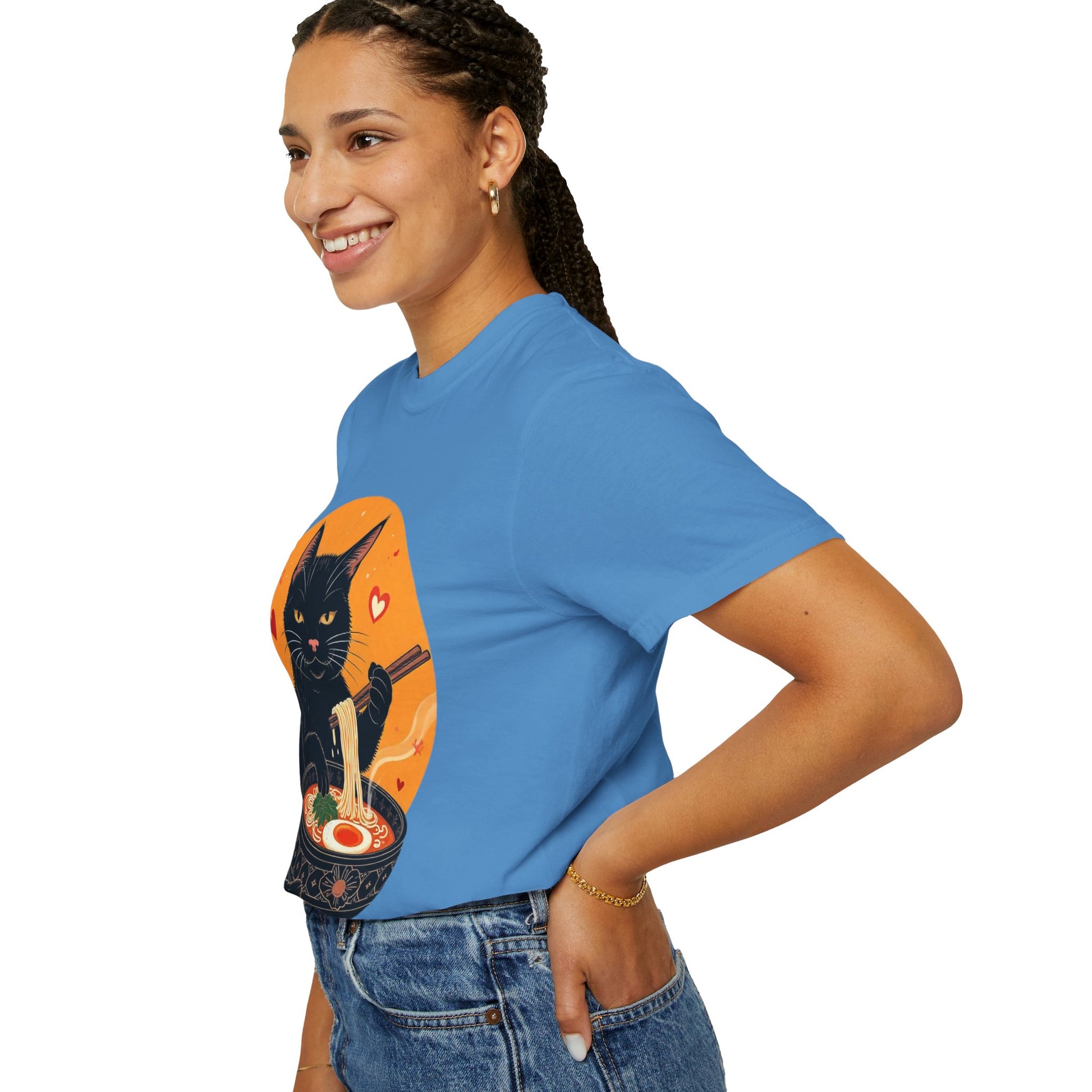 Indulge in cozy vibes with this unisex garment-dyed T-shirt, perfect for cat lovers and ramen enthusiasts alike. The playful design features a charming black cat enjoying a bowl of ramen, adding a touch of whimsy to your wardrobe. Ideal for casual outings, movie nights, or lounging at home, this tee is versatile enough for any occasion. It's the perfect gift for holidays like Cat Day, birthdays, or just to brighten someone's day! Made for everyone aged 18 and above, this T-shirt fits easily into a modern lifestyle, delivering comfort and style in one adorable package.