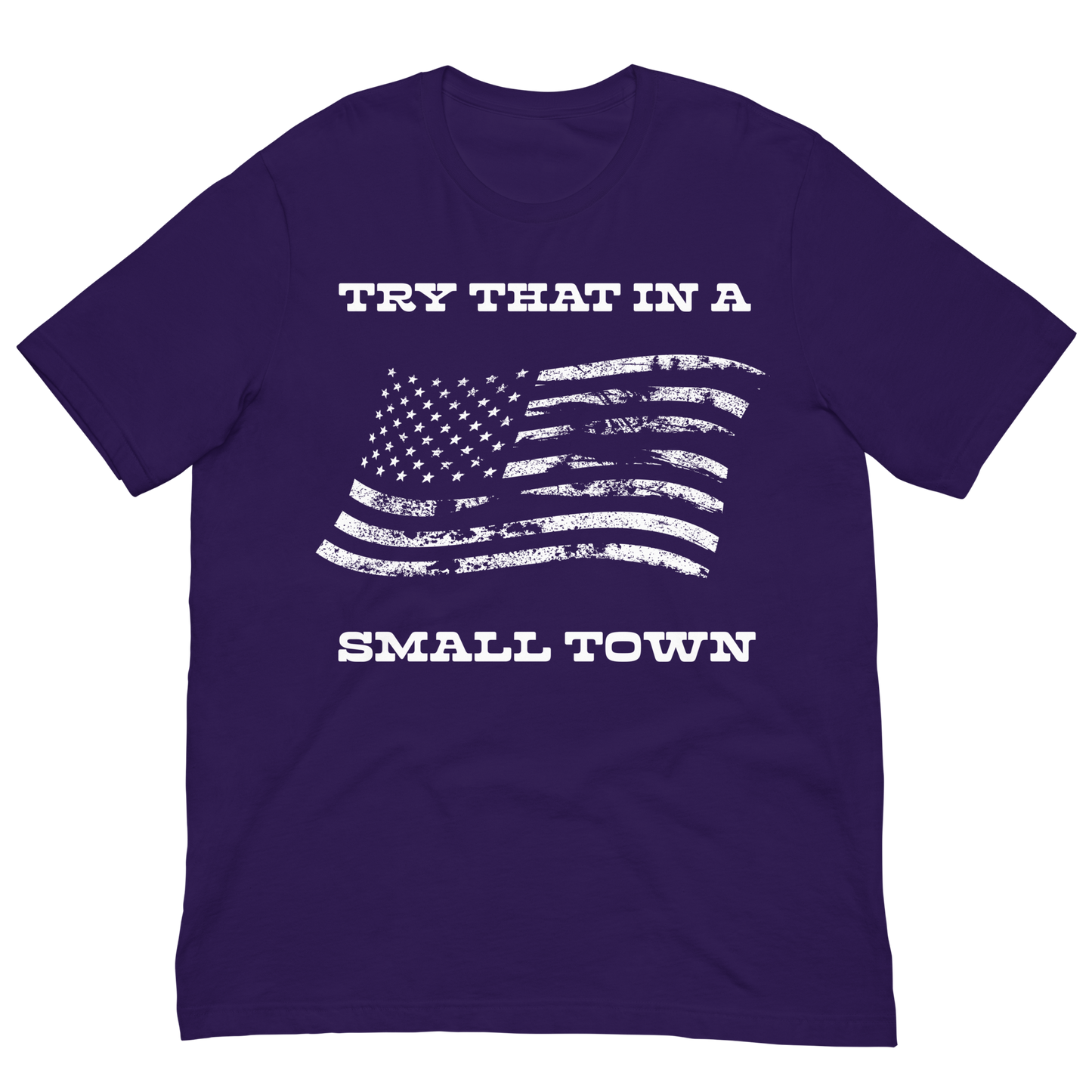 Unisex t-shirt Vintage Distressed American Flag T-Shirt - Try That In A Small Town Retro Graphic Tee | Patriotic Americana Classic Shirt.
